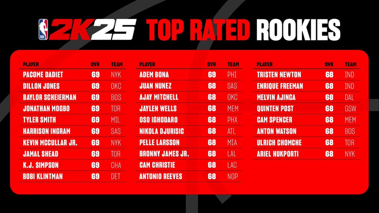 2K高層2K Ronnie今日在社群媒體上公佈了今年新秀在2k25中的能力值。
