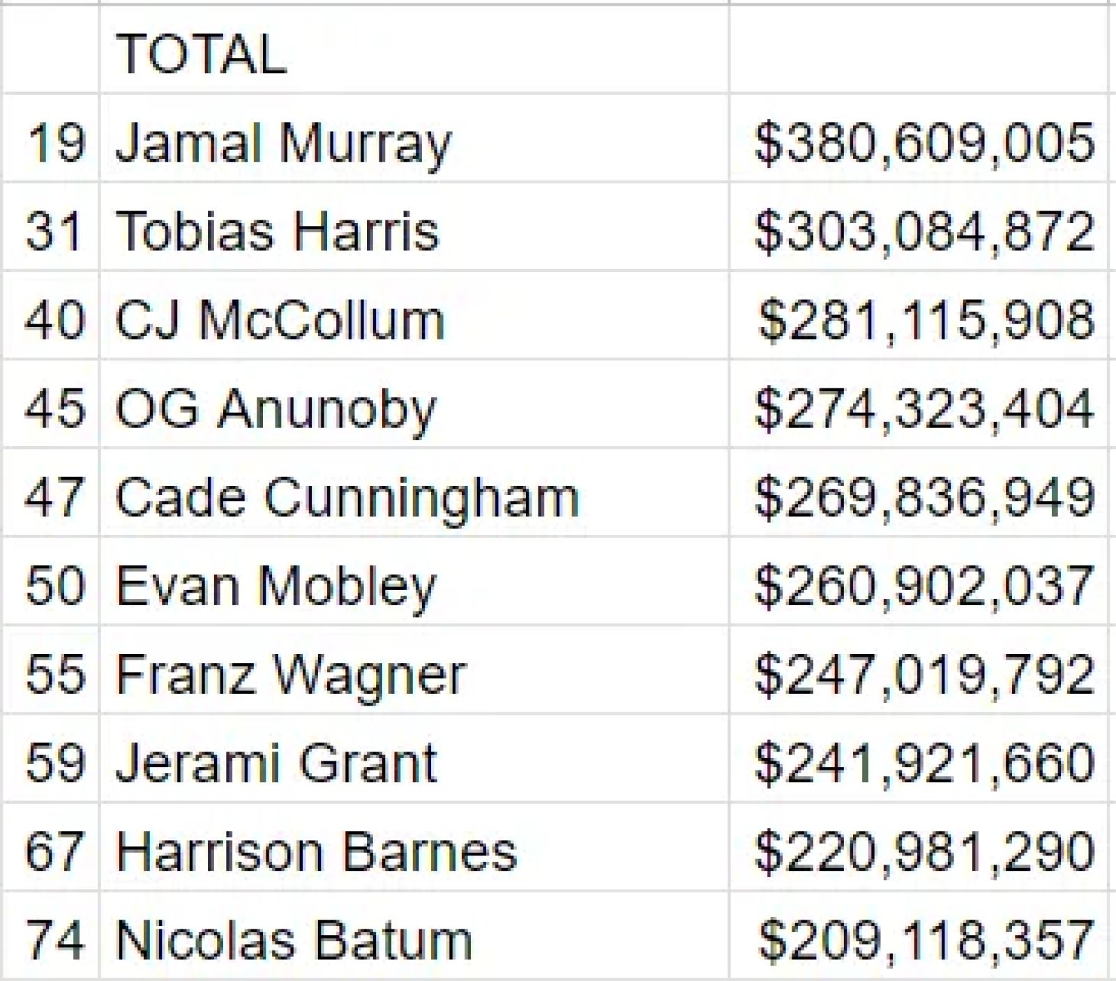 Murray目前被保障的薪水總額是3.8億美元,第二的是Tobias Harris(3.0億)。